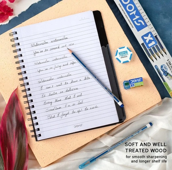 DOMS X1 Xtra Super Dark Pencils Box Pack | Hexagonal Shape For Easy Holding & Comfort | Free Eraser, Scale & Pencil Cap Inside | Dark & Neat Handwriting | Pack of 10 Pencils