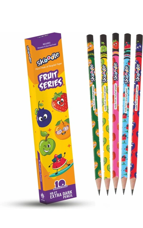 SKOODLE Fruit Series Paper Pencils, Super Dark Pencils, 100% Recycled Pencil, Non-Toxic, Set of 10 pencils, 1 sharper and 1 dust-free Eraser, gift for kids